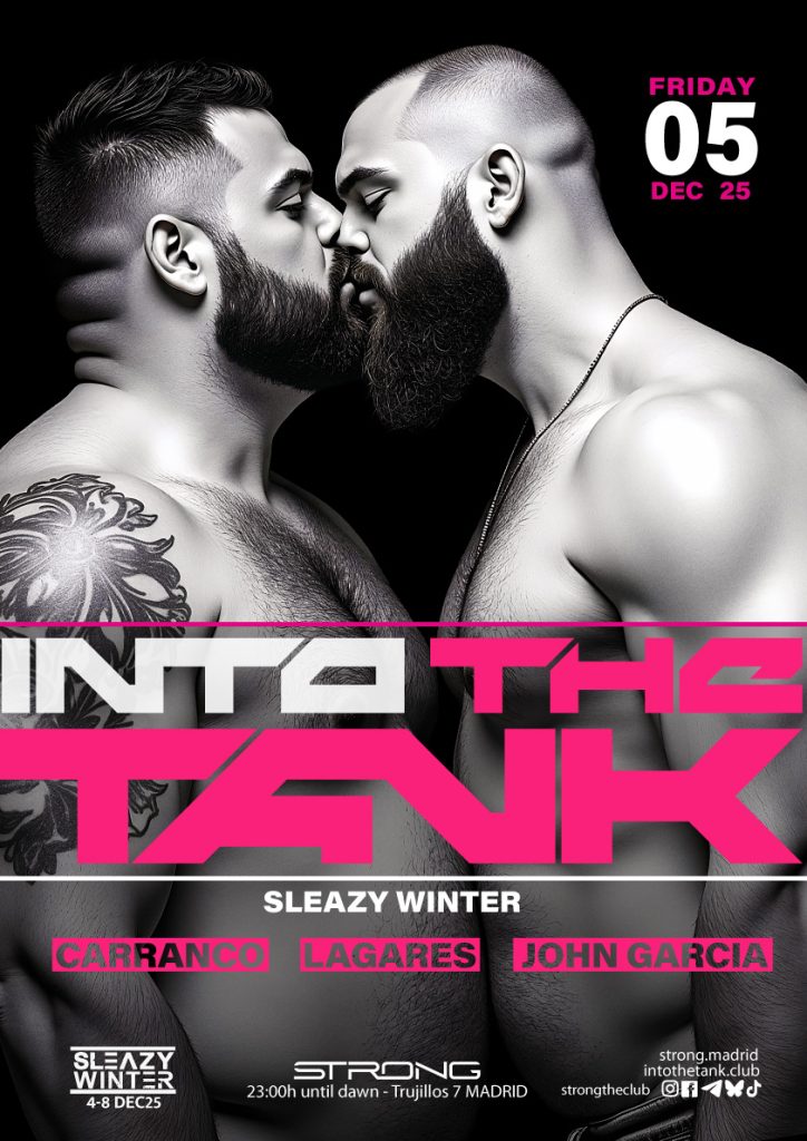 Join 𝗜𝗡𝗧𝗢 𝗧𝗛𝗘 𝗧𝗔𝗡𝗞, where hundreds upon hundreds of men come together to dance to seductive beats, in an electrifying atmosphere charged with raw masculine energy, action, and unleashed desire. From the overflowing dancefloor to the darkest corners… the intensity never lets up. 𝗖𝗔𝗥𝗥𝗔𝗡𝗖𝗢, 𝗟𝗔𝗚𝗔𝗥𝗘𝗦, and 𝗝𝗢𝗛𝗡 𝗚𝗔𝗥𝗖𝗜𝗔 will take you on a sonic journey with powerful, hypnotic beats. Explore fully equipped playrooms, labyrinths, and a multitude of private stalls. Unleash your wildest side in your favorite fetish gear and own the dancefloor.