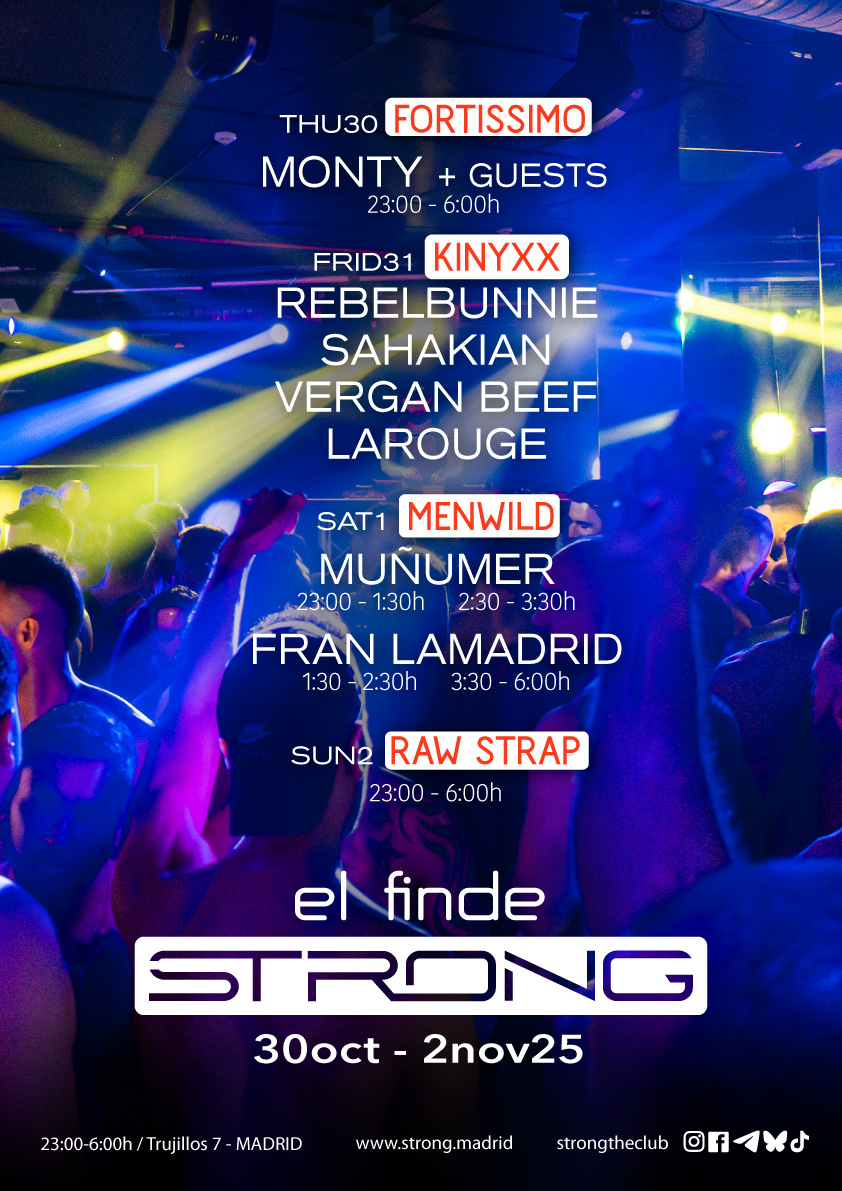 una fiesta de códigos: jockstraps, arneses, ropa interior, sport gear o simplemente d3snud0s. Un espacio para liberar cuerpo y actitud, entre fetiche, libido y ritmos oscuros. Madrid se desviste.